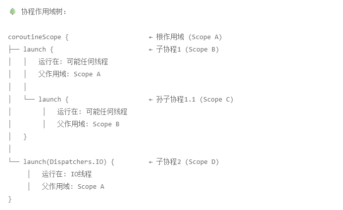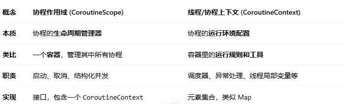 <font style="color:rgb(17, 17, 51);background-color:rgba(175, 184, 193, 0.2);">coroutineScope</font>会创建一个子协程作用域,集成父协程的上下文,父协程会自动等待所有在<font style="color:rgb(17, 17, 51);background-color:rgba(175, 184, 193, 0.2);">coroutineScope</font>中启动的子协程完成,才继续执行后续代码。如果子协程抛出异常,会取消其他子协程,并向上抛出异常。 - 虽然coroutineScope 和runBlocking 都可以 保证其作用域内的所 有代码和子协程在全部执行完之前,外部的协程会一直被挂起,但 coroutineScope函数只会阻塞当前协程,既不影响其他协程,也不影响任何线程,因此是不 会造成任何性能上的问题的。而runBlocking会挂起外部线程 。